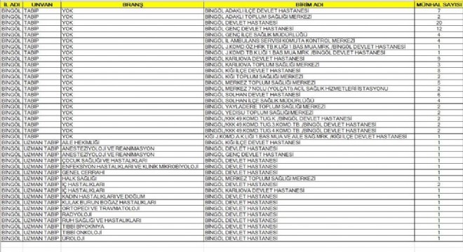 Sağlık Bakanlığı merkezi atama ile Bingöl’e 119 hekim ve uzman hekim ataması için kadro açtı. Yeni açılan kadrolar İl Sağlık Müdürlüğü sosyal medya hesabından duyuruldu. Buna göre Bingöl Merkez Devlet Hastanesi, Adaklı İlçe Devlet Hastanesi, Genç Devlet Hastanesi, Genç İlçe Sağlık Müdürlüğü, Bingöl İl Ambulans Servisi Komuta Kontrol Merkezi, Karlıova Devlet Hastanesi, Karlıova Toplum Sağlığı Merkezi, Kiğı İlçe Devlet Hastanesi, Bingöl Kiğı Toplum Sağlığı Merkezi, Bingöl Merkez Toplum Sağlığı Merkezi, Bingöl Merkez 7 No'lu (Yolçatı) Acil Sağlık Hizmetleri İstasyonu, Solhan Devlet Hastanesi, Solhan İlçe Sağlık Müdürlüğü, Yayladere Toplum Sağlığı Merkezi, Yedisu Toplum Sağlığı Merkezi, Kiğı İlçe Devlet Hastanesi, Çocuk Sağlığı ve Hastalıkları, Kadın Hastalıkları ve Doğum Hastanesine 119 hekim için kadro açıldığı duyuruldu.