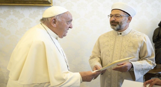 Başkan Erbaş, aile müessesinin de ikili görüşmelerinde gündeme geldiğini ifade ederek, “Ailenin çok önemli olduğu ve aileyi tehdit eden unsurlar konusunda istişarelerde bulunduk. Bize emanet olan ve hepimizin evi durumunda olan dünyamız yani çevre konusundaki düşüncelerimizi de paylaştık. Bu konuda da çevrenin korunması, ailenin korunması, dünyanın korunması konusunda neler yapılabildiği hususlarını kendisiyle istişare ettik. Papa, bu konularla ilgili yapılması gereken çok işler olduğunu vurgulayarak, Cumhurbaşkanı'mıza dünya barışı için yaptığı çalışma ve gayretlerinden dolayı tekrar teşekkür etti” diye konuştu.