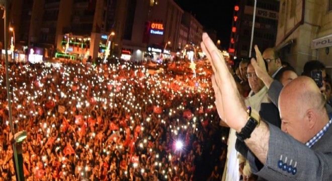 Büyükşehir Belediye Başkanı Mehmet Sekmen, Erzurum’un milli iradenin bayraktar şehri olduğunu belirtti. Sekmen, sözlerini şöyle tamamladı: “Medeniyetini barış ile inşa edenlerin, hak isteyene hakkını, başkaldıranın başını ezenlerin vatanında Başkomutanımızın dirayetiyle istiklal ve istikbalimiz için fert fert ay yıldızlı bayrağımızın sancağı olduk. O gece aziz milletimiz Hak ve Vatan davasının sırrına erenlerle tek vücut olarak, hainlere asla geçit vermedi. O günü hafızamızdan hiç çıkarmayacağız. Terörist başı satılmış FETÖ ve postallı işbirlikçilerinin bu aziz vatana kastını asla unutmadık ve unutmayacağız da Bu vesileyle vatanımız, milletimiz, ezanımız ve ay yıldızlı bayrağımız uğruna şehit düşen kahramanlarımızı, demokrasi şehitlerimizi saygı, sevgi, rahmet ve minnetle anıyorum. Destan yazdığımız o gece gazilik mertebesine ulaşan yiğitlerimize ve nene hatunlarımıza da şükranlarımı sunuyorum. Şehitlerimizin ruhları şad, makamları cennet olsun.”